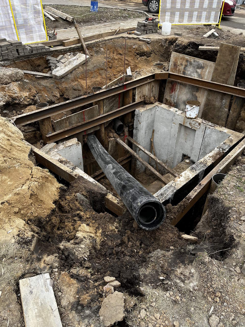 - Завершает бурение удаление излишков бентонита, проверка целостности проходов, монтаж нити или троса в каждую из проложенных труб, зачеканка отверстий и уборка стройплощадки.